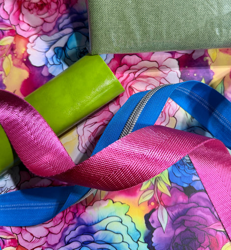 1 yard Watercolor Roses canvas 5 yards of 1“ Royalty webbing 3 yards of Eucalyptus w/ Gold teeth zipper  18” roll of Lilac Faux Leather   18” roll of Light Sage Super Smooth Vinyl